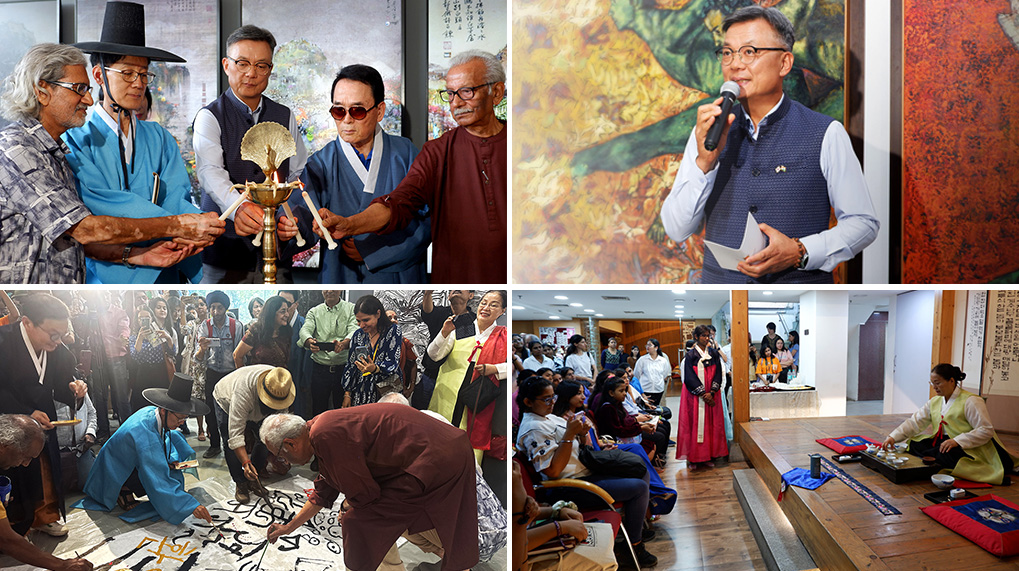 In addition to the visual arts, the exhibition featured many cultural events. Attendees were treated to a Korean & Indian poem recitation, adding literary depth to the event. Hongjoo Yi, a distinguished figure in the world of traditional Korean tea culture, demonstrated a traditional Korean tea ceremony and hosted a seminar. As a tea master, she has dedicated her life to the practice, education, and preservation of Korean tea ceremonies. Hongjoo Yi's seminar highlighted the significance of tea in both cultures and offered insights into the shared tea traditions of Korea and India.