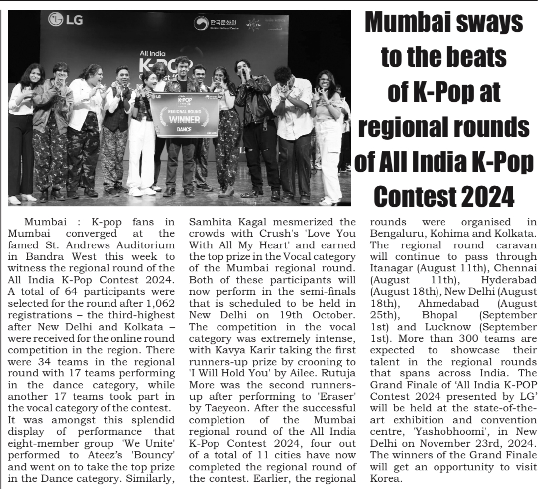 After the successful completion of the Mumbai regional round of the All India K-Pop Contest 2024, four out of a total of 11 cities have now completed the regional round of the contest. Earlier, the regional rounds were organised in Bengaluru, Kohima and Kolkata. The regional round caravan will continue to pass through Itanagar (August 11th), Chennai (August 11th), Hyderabad (August 18th), New Delhi (August 18th), Ahmedabad (August 25th), Bhopal (September 1st) and Lucknow (September 1st). More than 300 teams are expected to showcase their talent in the regional rounds that spans across India. The Grand Finale of ‘All India K-POP Contest 2024 presented by LG’ will be held at the state-of-the-art exhibition and convention centre, 'Yashobhoomi', in New Delhi on November 23rd, 2024. The winners of the Grand Finale will get an opportunity to visit Korea.