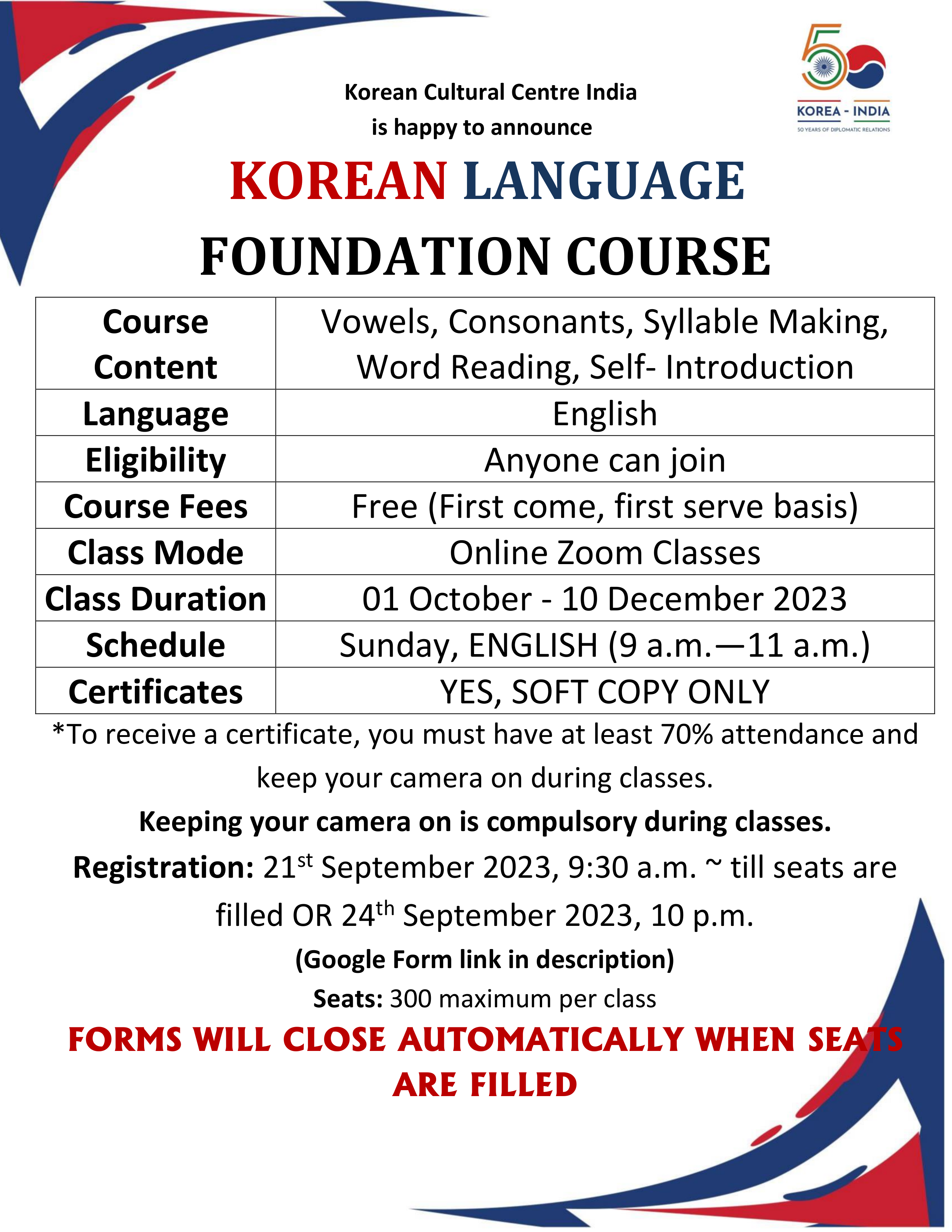 For any enquiries: mail us at kcci_education@koreanculture.in or call us on 01143345000 / 01143345041