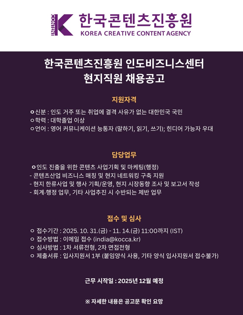 한국콘텐츠진흥원 인도비즈니스센터 현지직원 채용공고