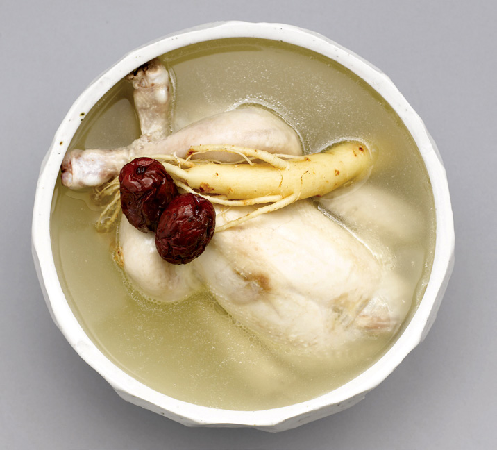 정의 손질한 닭 한 마리에 인삼을 넣고 푹 곤 음식. |